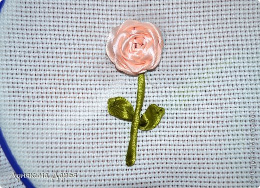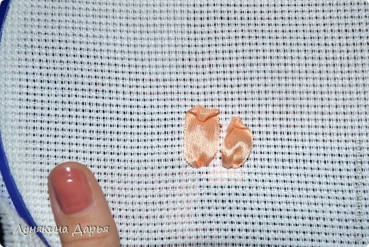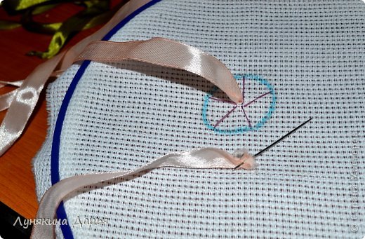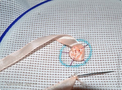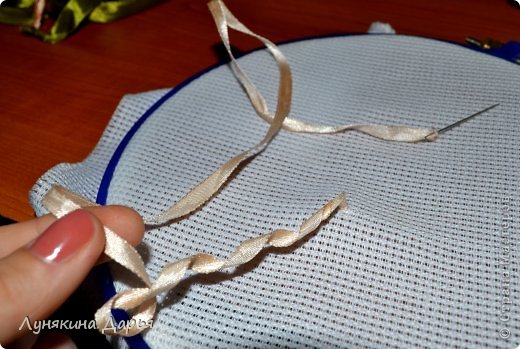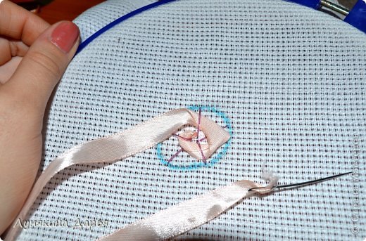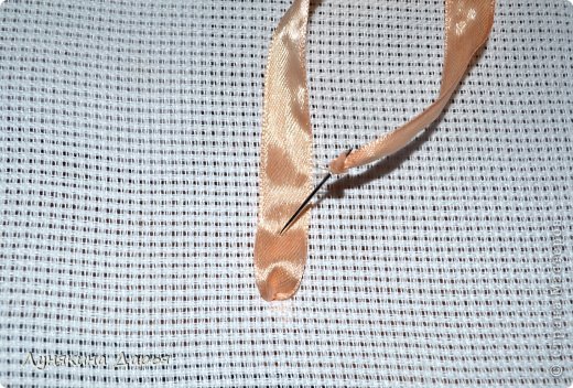 9. Следующий стежок - стежок с завитком. Протягиваем иглу на лицевую сторону, укладываем ленту, выполняем прокол иглой на изнанку не на свободное поле канвы, а по центру ленты.