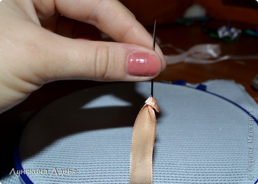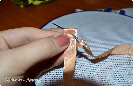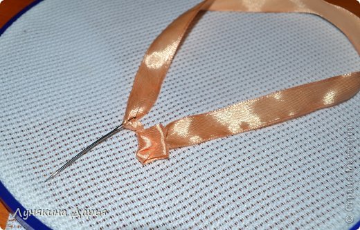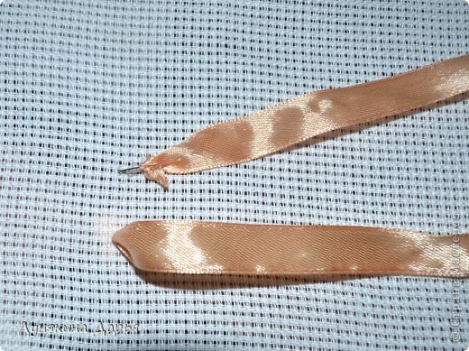 Втягиваем ленту в иглу. Прокалываем ленту по центру в 1 см от края. Край ленты для удобства можно обжечь зажигалкой, чтобы она не растрепалась во время вышивки.