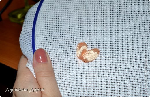 На изнаночной стороне по завершению вышивания мотива обрезаем ленту, опаливаем конец, подшиваем потайными стежками.