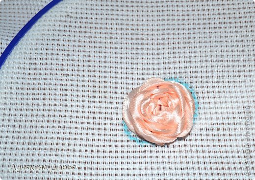16. Когда весь круг заполнен лентой, протягиваем иглу на изнаночную сторону, обрезаем ленту, обжигаем, подшиваем конец потайными стежками.