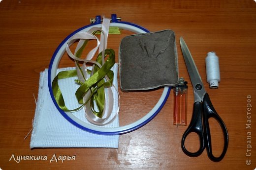 2. Начну с инструментов. Нам понадобятся: пяльцы, канва и другая ткань, атласные ленты (для вышивки рекомендовано брать ленты от 0.3 см до 1.5 см шириной), иглы с широким ушком, ножницы, нитки в цвет ткани или в цвет лент, зажигалка.