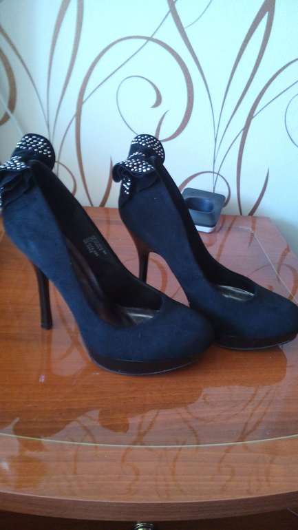 Туфли б/у один раз 10 минут,больше пройти не смогла они мне просто малы,замша( не натуральная) на пятках бантик со стразиками. Размер 38. Ножка в них очень стойная.