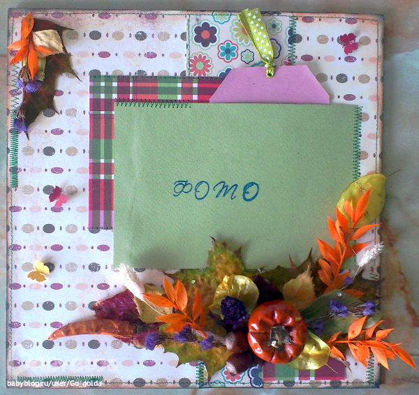 Использовала тыковку маленькую, орешки лесные, лунарию, кленовые листья, перчик, вишевй листок, березовые листочки, не знаю название оранжевых веток и сиреневых цветочков, это все сухоцветы, листья тоже высушены, покрыты лаком, основа скрапбумага приклееная на 2 мм картон с подставкой