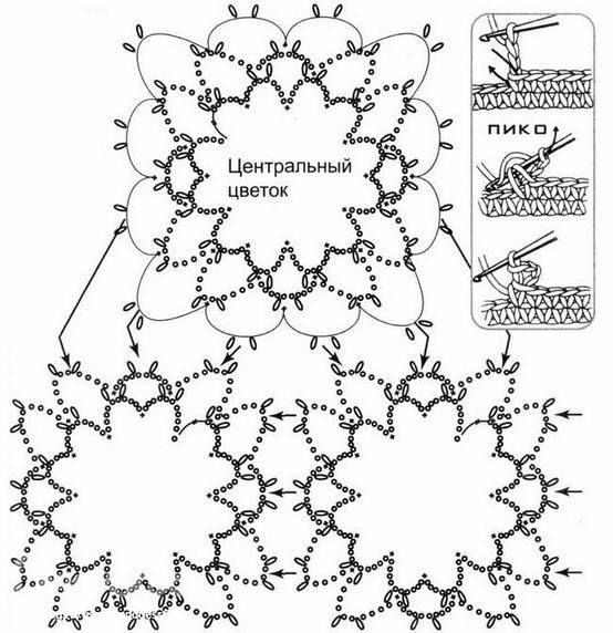 Вариант соединения мотивов между собой смотрите на схеме 2. Наденьте деталь из розочек на колпачок и провяжите 1 ряд соединительными петлями по кругу нижней детали, одновременно делая привязку ажурной детали к краю чехла. По нижнему краю чехла выполните один ряд СБН с «пико».