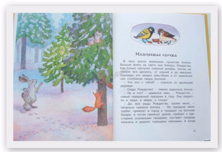 "Маленькая елочка". Елочка очень боялась, что ее срубят под Рождество и после праздника она завянет.Но маленькую елочку перевезли и посадили во дворе, чтобы наряжать на праздник.