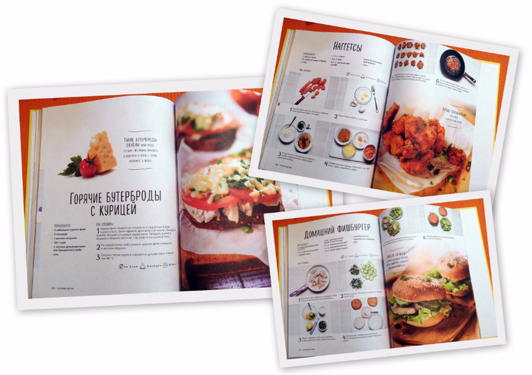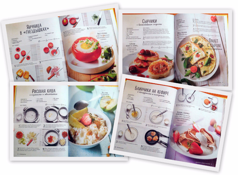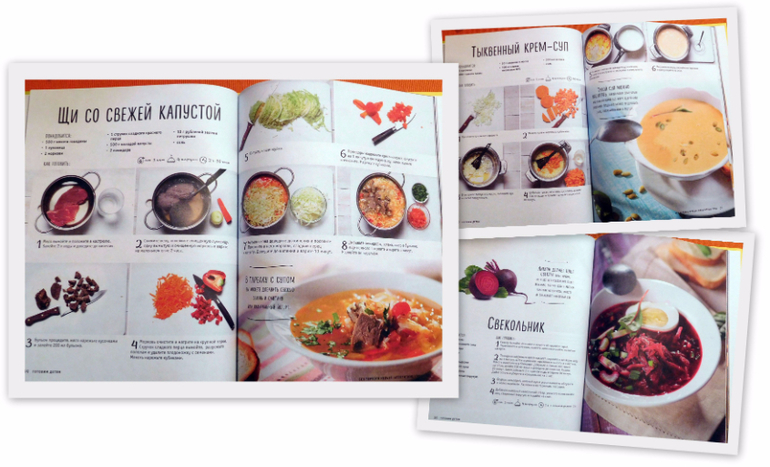 Рецепты обыденные, без экзотики, из продуктов, которые, как правило, есть в холодильнике любой семьи. Каждый рецепт подробно расписан. Есть список продуктов, процесс приготовления блюда расписан по шагам (часто с фотографиями каждого шага). К каждому блюду есть указание, с какого возраста оно рекомендовано ребенку; написано, сколько времени займет приготовление блюда и сколько порций получим в итоге.