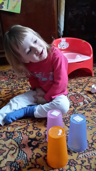 5. И в наперстки мы поиграли :) Прятали сначала одну игрушку, а потом я задачу усложнила и спрятала три игрушки и Надюша угадывала какая лежит под каким стаканом.