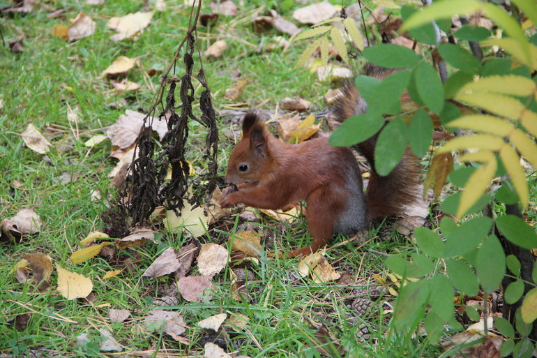 У нас про эту белку столько было новостей в интернете)) Я правда не надеялась увидеть, но повезло. А с рук кормить всегда боялась — думала, что палец откусит)) В этот раз решилась — у них оказывается такие холодные лапки))