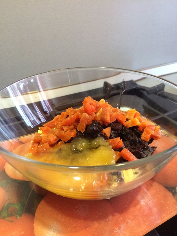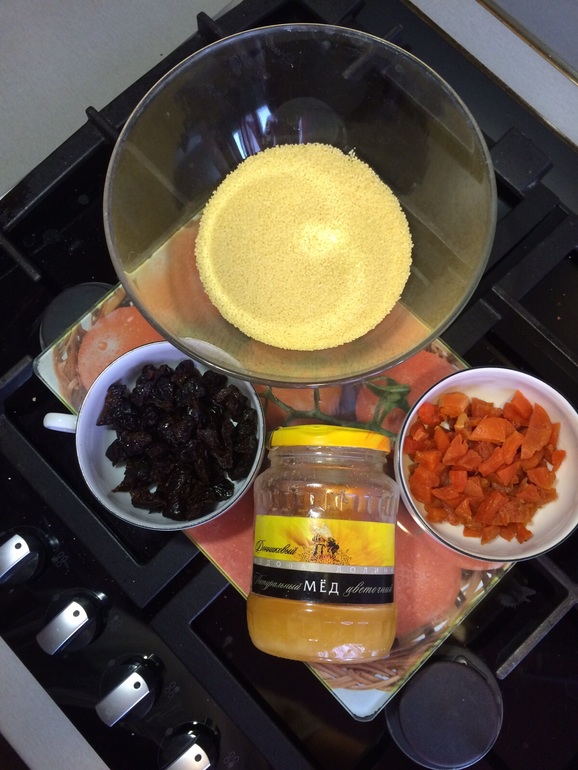 нарезаем сухофрукты,смешиваем с медом и кус-кусом