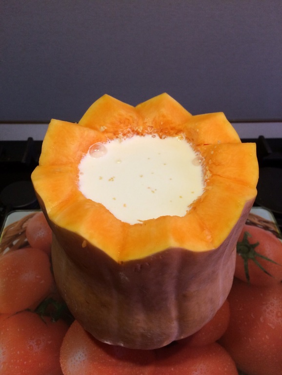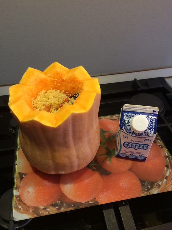 Нам понадобилась,она тыква(2кг),кус-кус(300г),чернослив(100г),курага(100г),сливки10%(250мл),мед(3 столовые ложки).