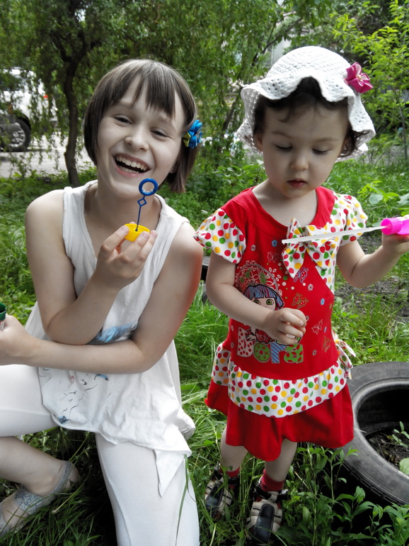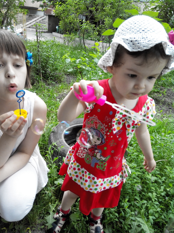 Купили новые. Можно и не дуть - от взмаха руки вереница пузырей,..ручка-"грабля", Катя в восторге)) Ну, конечно, она их за один присест - что не выпустила, то вылила на ноги себе. Отбираю пустой, липкий флакон (к тому же грязный - падал!)), не отдает: