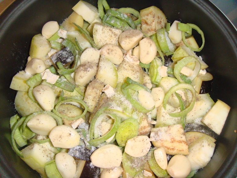 Добавить лук порей, чеснок, посолить, поперчить, перемешать. Влить стакан воды:
