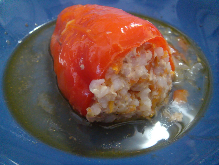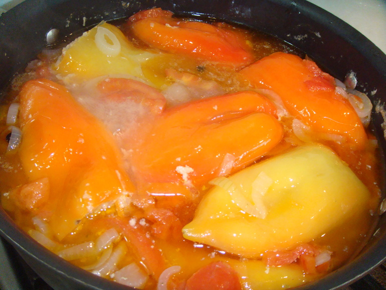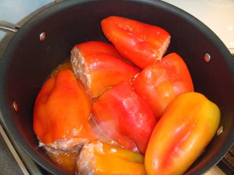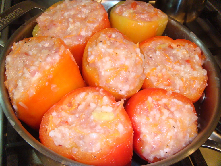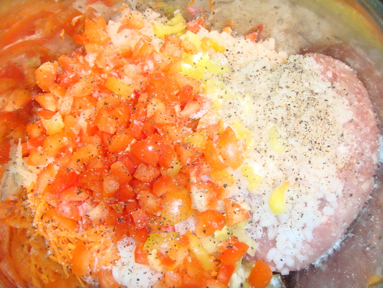Вычистить болгарские перцы. Крышечки мелко нарезать в начинку. Посолить, поперчить: