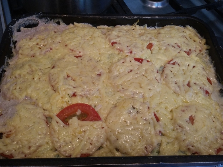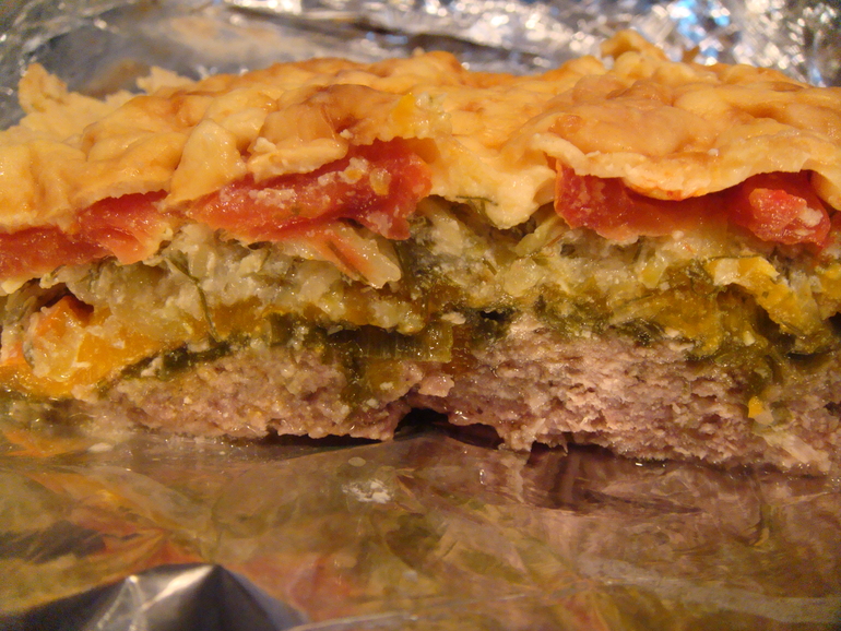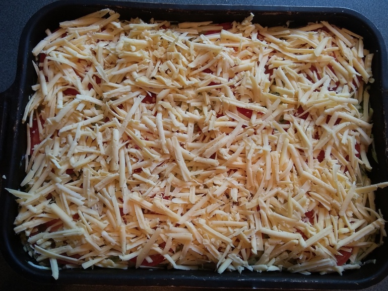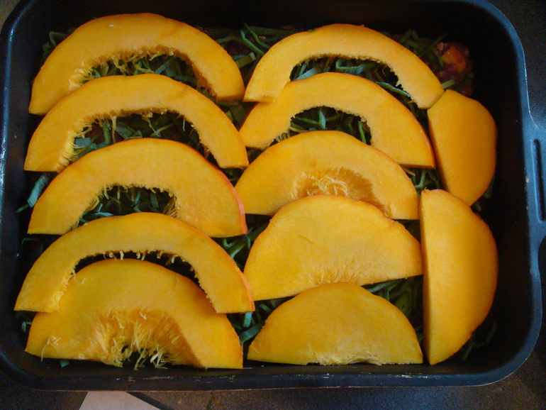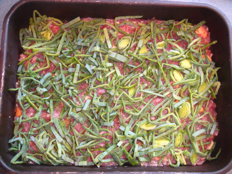 Влить немного воды и перемешать фарш. Выложить его в форму для запекания ровным слоем: