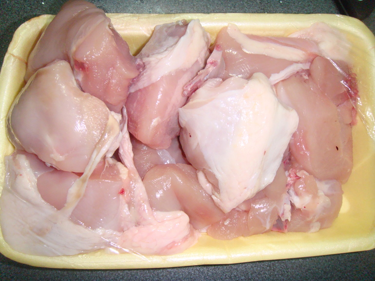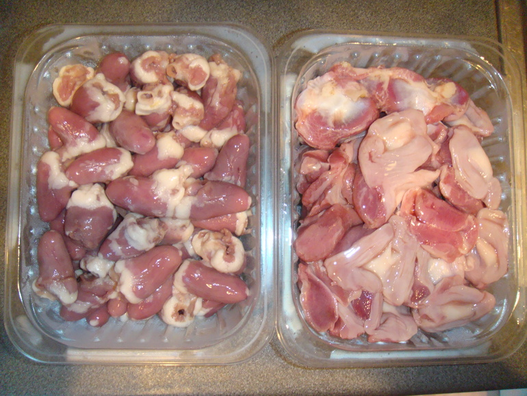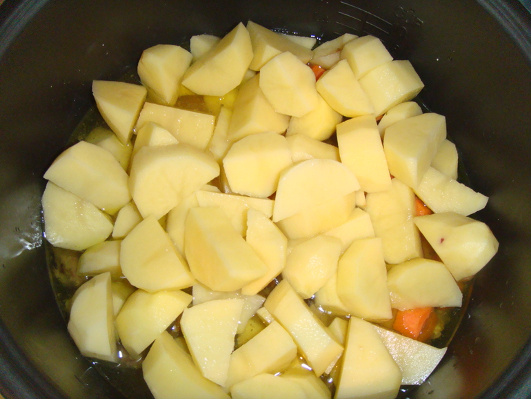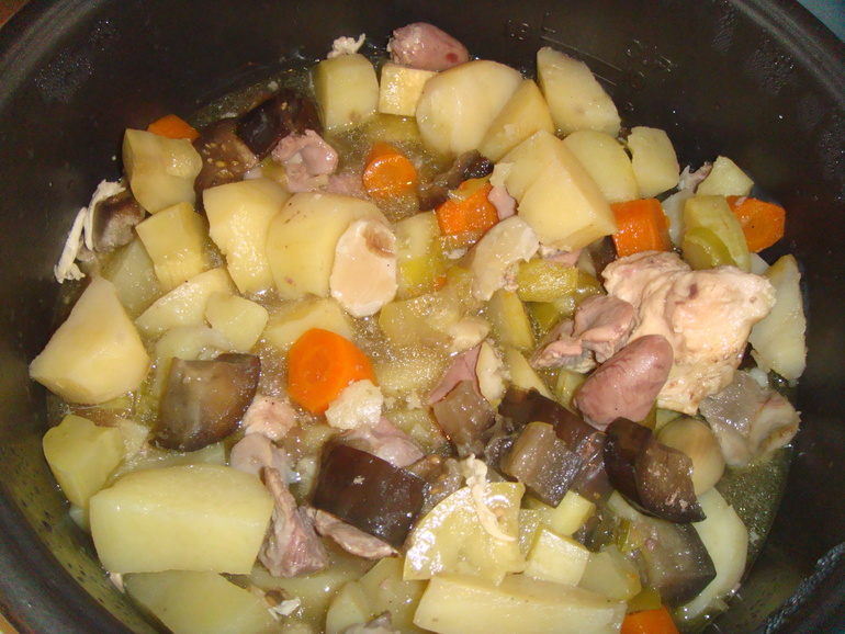 Положить в чашу мультиварки куриные потрошки, лук, морковь, картошку:
