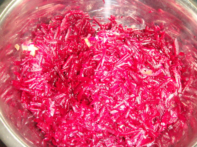 Отварить свеклу. Буженину нарезать мелкими брусками: