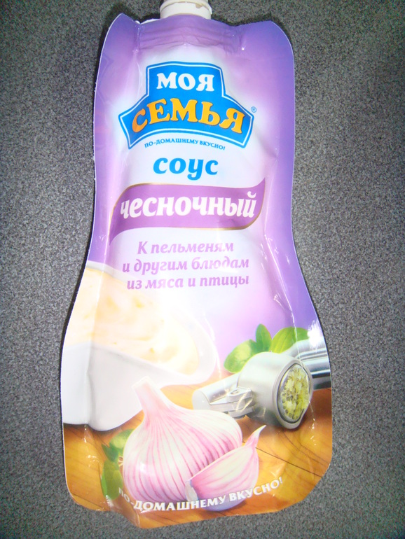 Заправить чесночным соусом (или смешать сметану с натертым чесноком и солью):