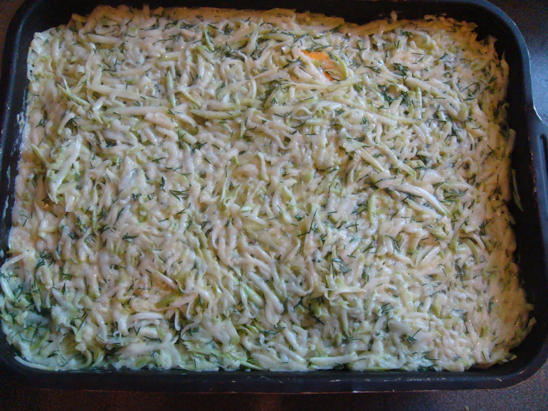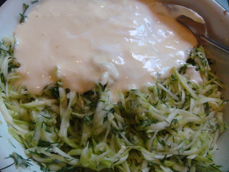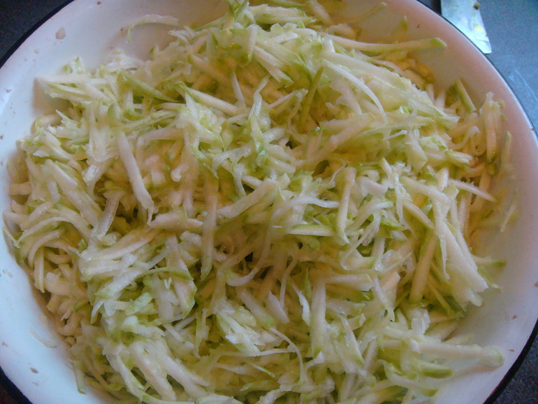Натереть на крупной терке кабачки. Посолить и через 10 минут отжать: