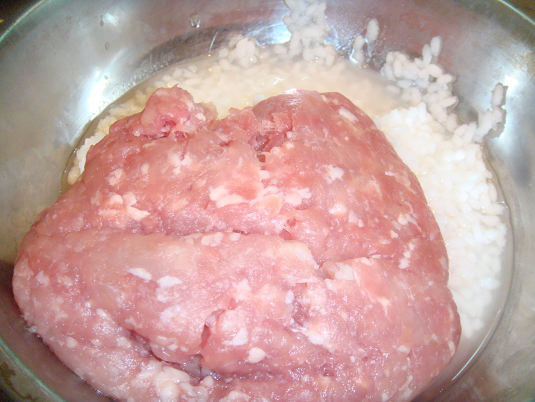 Добавить мясной фарш и рис с небольшим количеством воды, в котором он варился:
