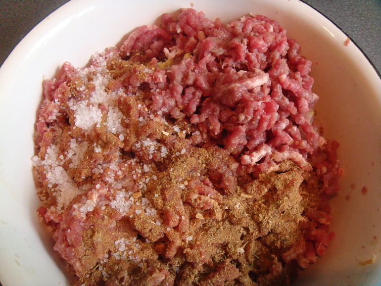 Смолоть фарш. Добавить соль, перец, специи для мяса: