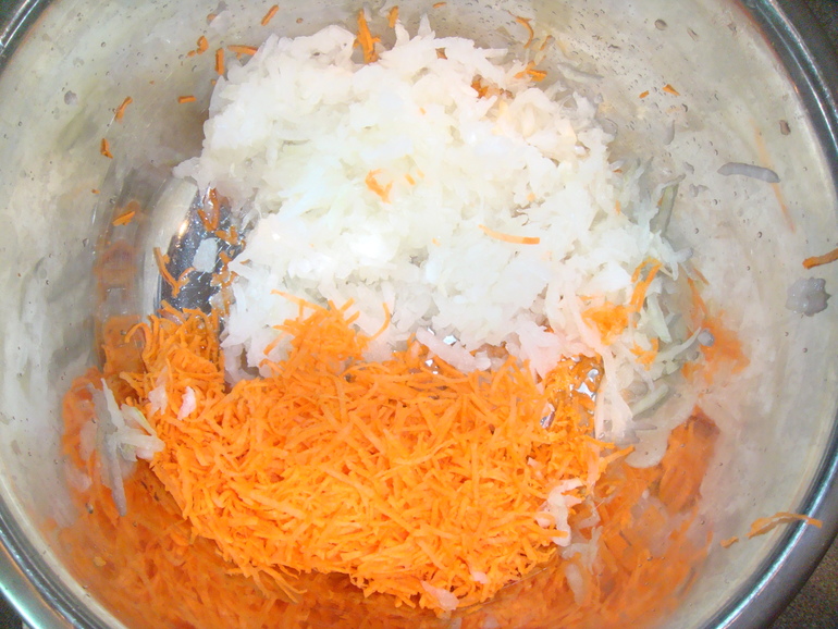 Отварить до полуготовности рис. Натереть на мелкой терке сырую морковку и на крупной терке сырой лук: