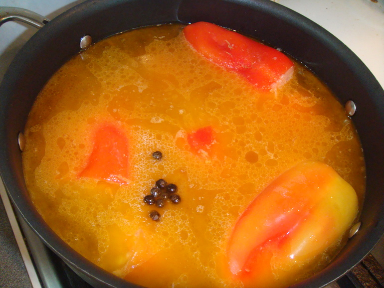 Залить кипятком и положить бульонный куриный кубик, душистый перец, лавровый лист: