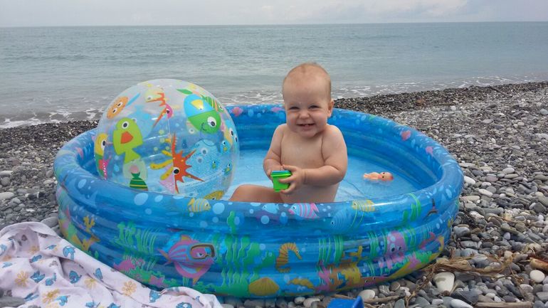 Мне кажется мы безолаберные родители, вчера на пляже сидим, пьем пиво. Мимо проползает Лера и выплевывает камни изо рта...мы офигели. Ночью ее покусали комары, во всем поселке вырубили свет, не работал кондей и мы открыли окно. Ползает по камням, и вся в синяках. Бассейн с собой притащила))).