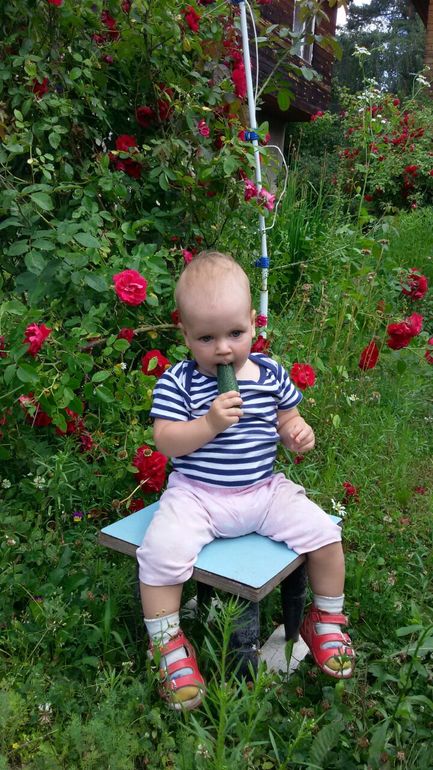 Лера научилась залезать на диван. Больше новых умелок нет, у нее все мысли и время занимают ягоды: смородина красная и черная, крыжовник, малина и вишня, поедает в огромных количествах. постоянно танцует, даже под мою колыбельную)).
