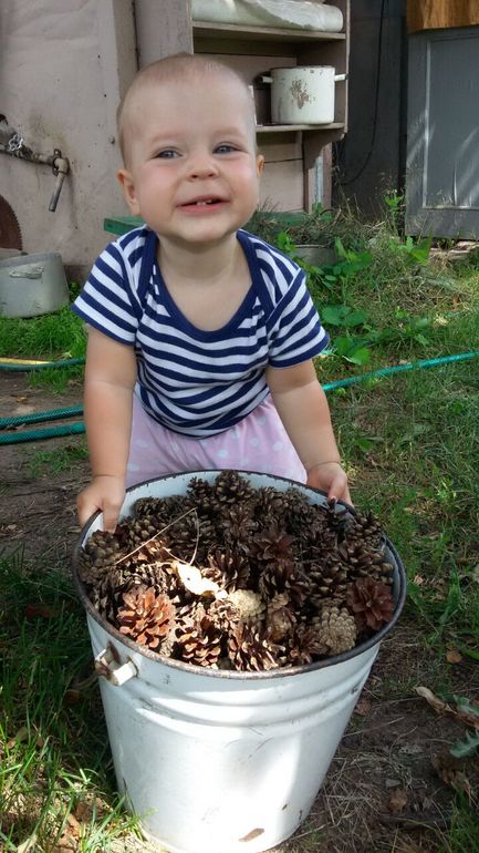 Шишки мы вместе собирали, я около ведра складывала, а она сидела и в ведро кидала, помогала)))). Чет в этом году очень много шишек.