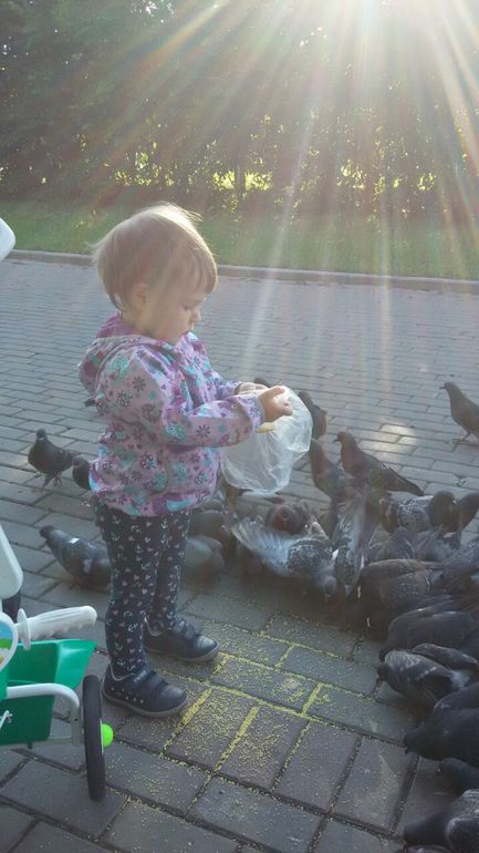 По прежнему животных предпочитает людям, я с какой то стороны ее понимаю, но блин..Август проведем в Москве, будем жить на детских площадках, чтоб в сентябре не шарахаться от малышей в садике. А так, ездили с ней океанариум на ВДНХ, очень понравилось, запомнила даже медуз, морского дракона и прочую мелочь, побывали в Ярославском дельфинарии, зоопарке и музее тропич.бабочек. Обожает кормить голубей, разговаривает с ними, решает кому и чего дать, воспитывает, чтоб не дрались и не лезли друг на друга.