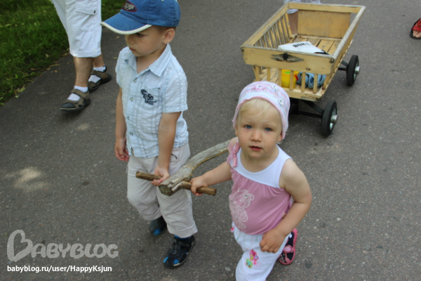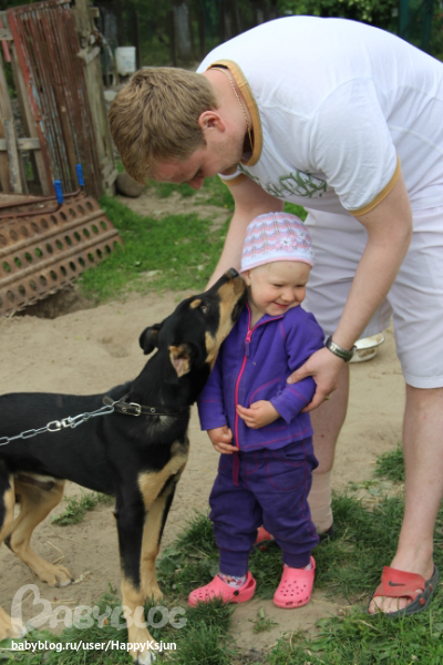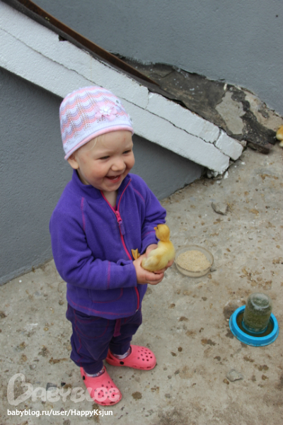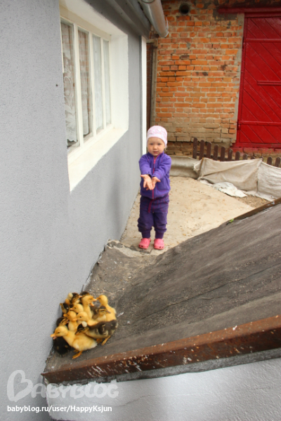 В деревне ей ооочень понравилось. В отличии от меня она чувствовала себя там в своей тарелке. Там случался у нее первый речевой прорыв. Видимо от обилия положительных эмоций. Оттуда мы привезли любовь к именам (теперь запоминает и повторяет имена, называет друзей по именам) и названия домашних животных (или если название сложное, то звуки этих животных). Особенно впечатлили утята. Она их по 100 раз на дню пересчитывала, научилась сама их ловить, гладить, проявлять заботу и теплые чувства к братьям меньшим. Подружилась с собакой - та напрыгивала, виляя хвостом, на Весту (не с разбегу конечно))))), клала передние лапы Вестуле на плечи, а Веста ее обнимала. Подкармливала иногда своих друзей)