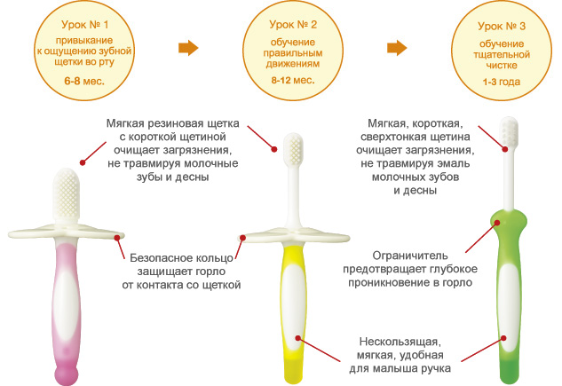 📌Начинать чистить зубы нужно с момента их появления. Сначала это могут быть специальные щетки-напальчники, затем детские щетки с короткой резиновой щетиной (в виде «пупырышек») и далее с мягкой сверхтонкой щетиной (см. фото).