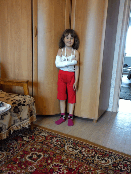 После выпускного мы продолжали ходить в сад до прошлой среды. Прихожу я значит за ребенышем, а она рассказывает, что с колеса упала и рукой ушиблась. Я думаю, ну упала и упала, с кем не бывает. Маришка веселая, играет, по лесенкам ползает. Пошли домой, слопали по мороженому, погуляли... а дома выясняется, что она сама раздеться не может, Правая рука не сгибается, хотя нет ни отека, ни синяка. Кушала тоже левой. И повезли мы ее в травмпункт. а у нас оказывается трещина... Наложили нам гипс-лангетку и отправили домой на 2 недели... ээх, теперь месяц лета потерян в плане купания :)