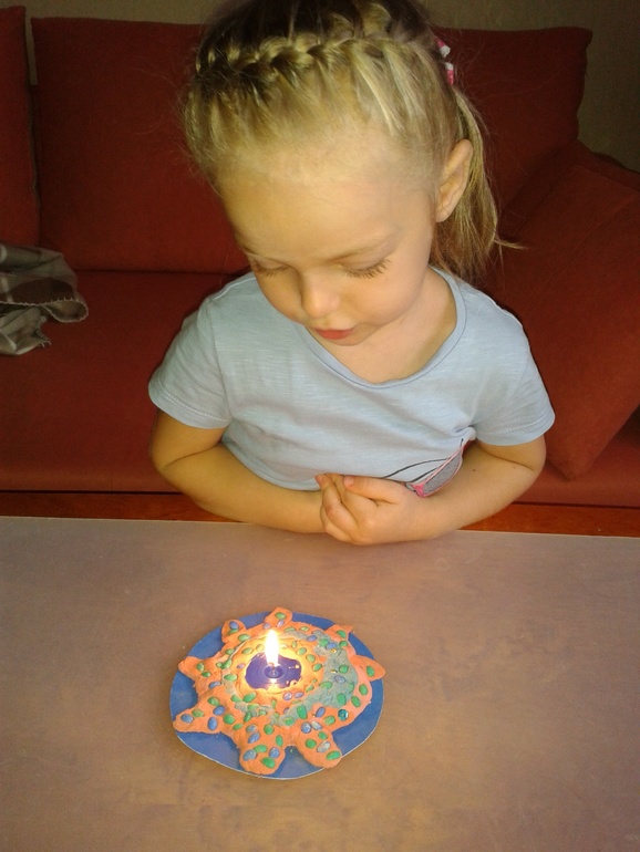 Пару недель назад в садике было совместное занятие детей и родителей, - лепили обрамление для свечей из соленого теста и украшали его всякой всячиной: блестками, крупой, крашеной фасолью. Олеся назвала круглые блестки веселИнками.