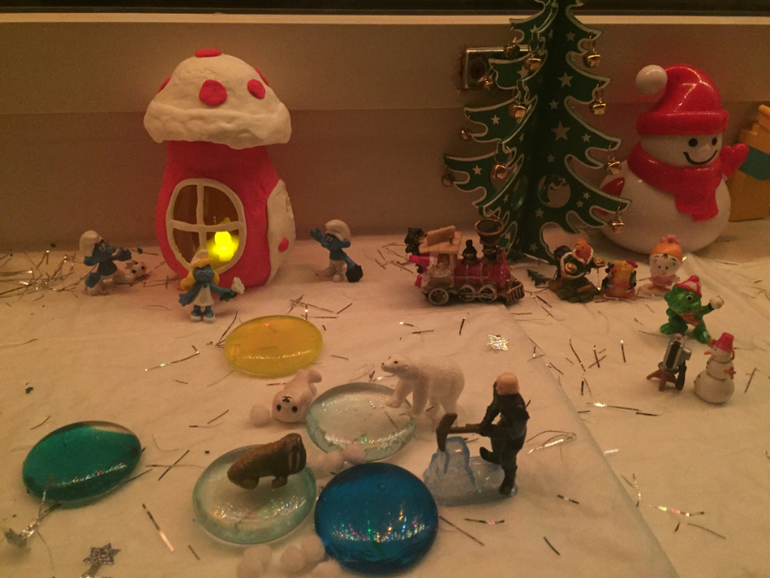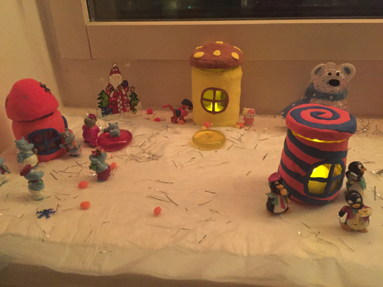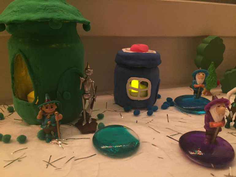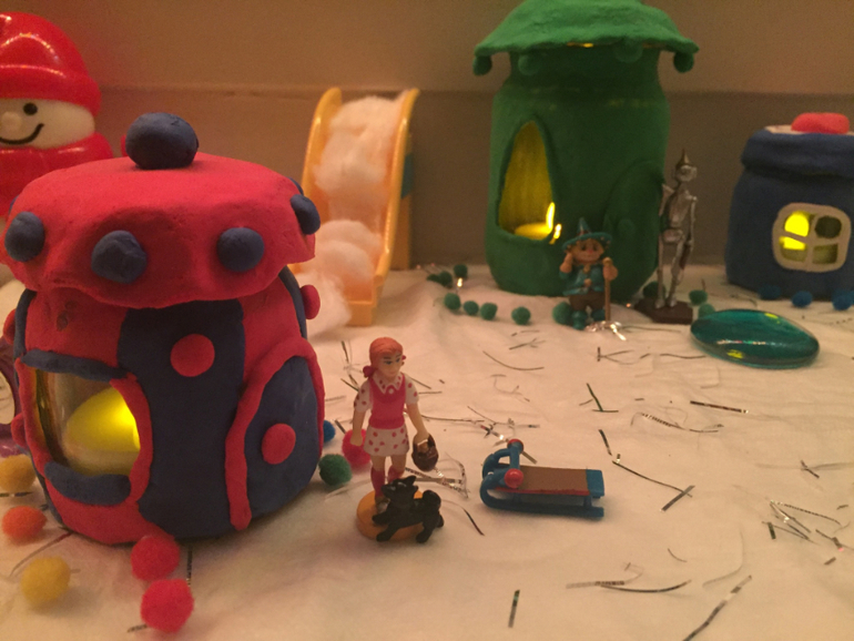 Поэтому, в Новогоднем городке у нас прибавление. Для Страшилы слепили зелёный домик, с крышей-шляпой с бубенчиками. Желтый - для жителей Желтой страны. Лев живет в лесу. Элли с Тотошкой поселились в домике, отобранном у пингвинов))