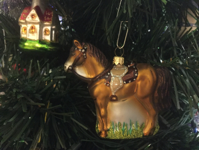 Лошадь. Стеклянная, очень мне нравится, но достали в этом году ее из коробки с отколовшимся кусочком. Повесили, но недолго ей осталось, так жаль(((