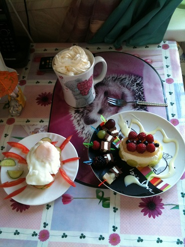 Справа - "пирожное": перевернутый творожок "Чудо "Тропический мусс" (украшение - черная смородина, малина, по периметру снизу для красоты и поддержки - тонко нарезанный виноград). Приготовили и сразу либо на подачу либо в морозилку на несколько минут, чтобы мусс и не осел и не испортил конструкцию. На шпажках нарезанный "Здрайвер" с ананасом, ежевикой, малиной, виноградом, вишней. Украшено сгущенкой