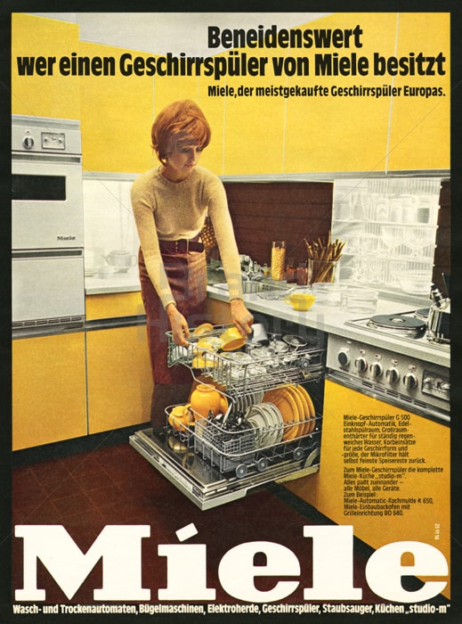 Посудомоечная машина Miele 1971 г. Возле нее тоже женщина и тоже очень счастливая.