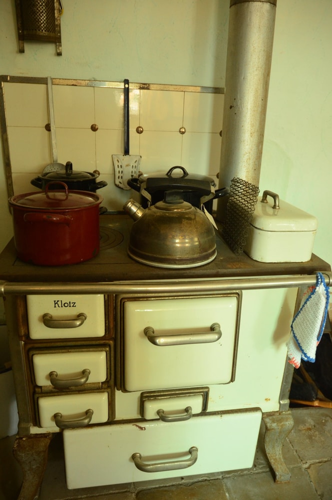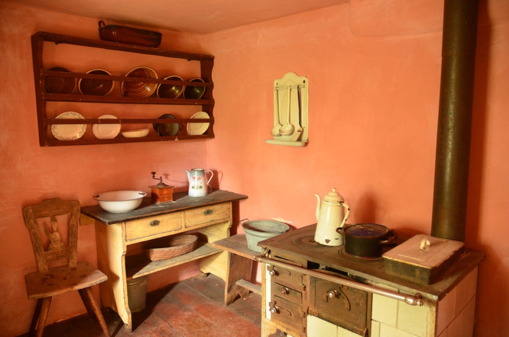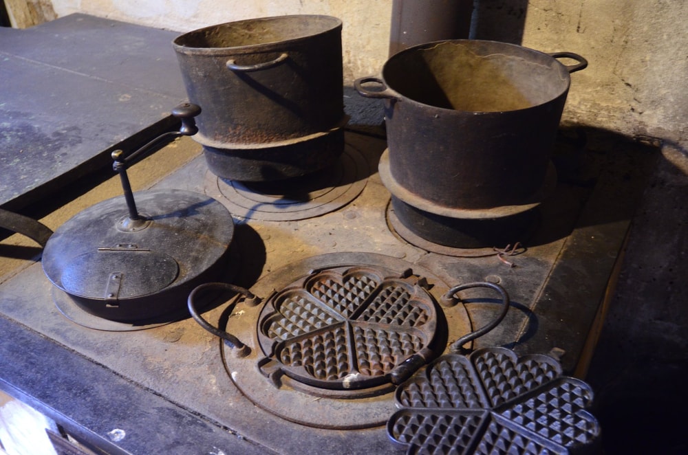 Наблюдая за темными задними каморками с чадящей печью, я поняла, почему женщины в прошлом так стремились выйти замуж за богатых женихов. Иначе вся жизнь пройдет в этой черной комнатке с единственным крошечным окошком, называемой "кухня". Весь чад уходил наверх, в трубу, отчего конусовидный потолок закоптился и пропитался запахами. Кругом тяжелая чугунная посуда, нечто каменное, что было прототипом раковины (только без проточной воды), редкие тарелки вдоль стены.