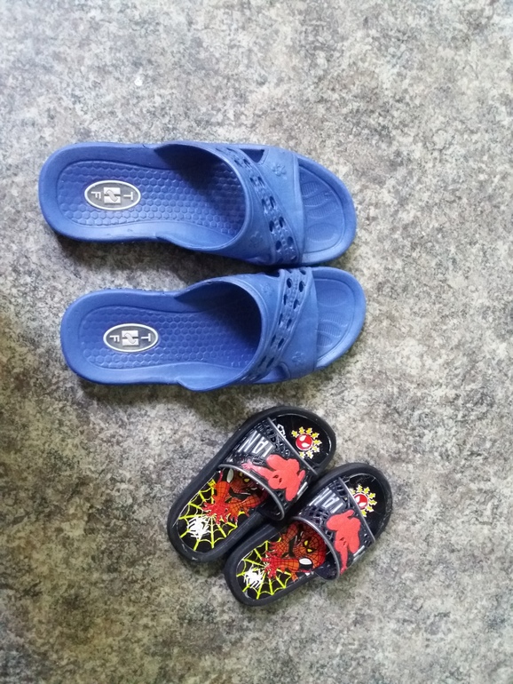 Из обуви взяли резиновые тапочки и себе и малышу.