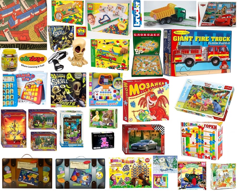 Целая куча всего---выросли . Все в идеальном и хорошем состоянии где то чуть коробочки пострадали у пазлов мелких. Большие с ручками все в идеале.