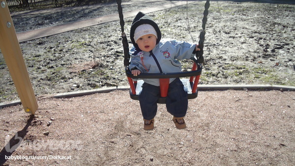 Мы не ходячие:)) когда не спит то мы обязательно ходим на площадку, Альбинка любит общаться с детьми, смотреть на них, агукает. Я беру ее на ручке и ношу показываю что детки делают, куличики, качаю на качелях ее и с горки катаю за ручки, одеваю ботиночки на каждую прогулку и вожу под трогать трогаем травку, веточки, пару раз даже куличи делали.