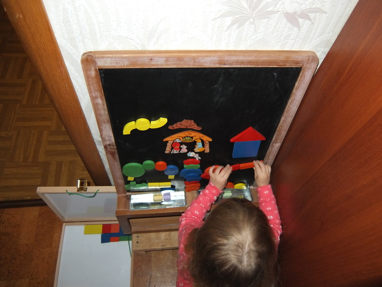 Кроме того, до сих пор пользуется популярностью стенд Икеа Лунс. Купили его Любе на годик. Вот уже почти 3 года радует нас. Занимает мало места (стоит у нас просто прислоненный к стене), поверхность и магнитная, и графитовая, внизу есть место для мелков. Рисуем обычными икеевскими мелками (другие лучше не покупать!!! они царапают поверхность и оставляют не очень четкий след, а икеевские отлично, они более рыхлые что ли...). И с магнитами Люба играет часто. Часть утащила на холодильник, там экспозицию меняет каждый день. А часть вот на этой доске. Магниты, кстати, у нас самые разные (бумажные с изображением разных предметов, деревянные Мапача с изображением животных, Сказки дерева, конструктор магнитный и набор Одень куклу: куклы с одежками).
