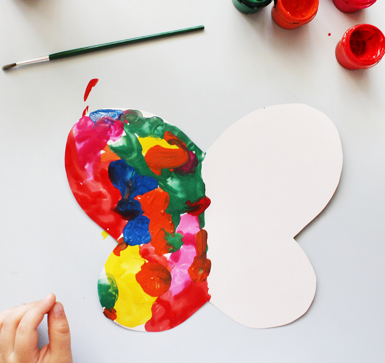 Когда половина бабочки будет закрашена, свернуть ее пополам по линии сгиба и пригладить ладошками.