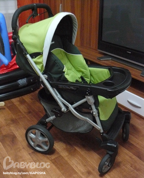 Особенности коляски Peg-Perego Uno: Механизм складывания типа "книжка". В сложенном положении коляска Peg-Perego Uno без поддержки стоит вертикально. Регулируемая спинка и подставка для ног превращают коляску Peg-Perego Uno в удобное спальное место. Переднее ограждение может регулироваться и сниматься, а также использоваться как мини-столик для игрушек или кормления. Коляска Peg-Perego Uno поставляется в комплекте с капюшоном , причем капюшон является водонепроницаемым и с помощью специальной застежки превращается в солнцезащитный тент. Все колеса Peg-Perego Uno имеют амортизаторы, тормоза, а передние могут фиксироваться в двух положениях: "прямо" и " свободное вращение". Большой диаметр колес. Родители по достоинству оценят большую корзину для вещей, держатель для бутылочки и регулируемую по высоте ручку, причем ручка может быть установлена в двух положениях, так что вы можете находится как спереди, так и сзади от ребенка. Шасси коляски Peg-Perego Uno покрыто специальным лаком, не подверженному воздействию влаги и солнечных лучей. Тканевые части коляски можно стирать при температуре 30° С.