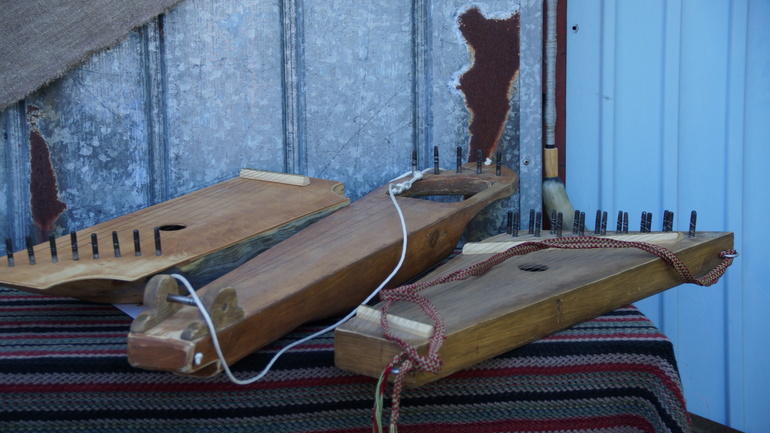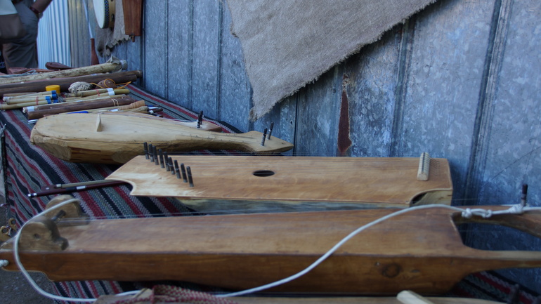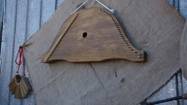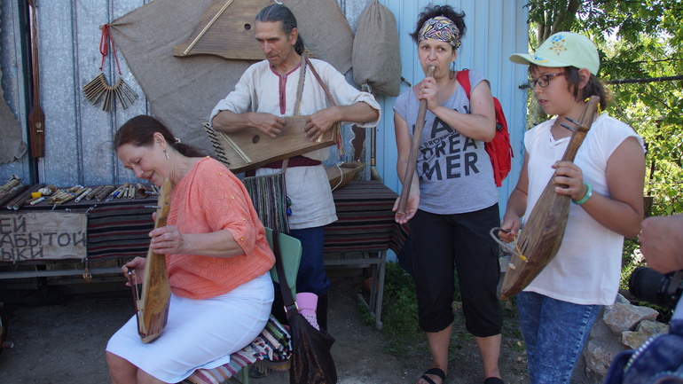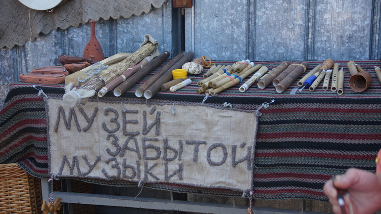 И вот снова - знакомство с потрясающим человеком - Сергей Плотников, приехал на фестиваль из Воронежской области и привез свой "Музей забытой музыки". Чего только у него не было: гусли, волынка, бубенца, колокольцы, лира.