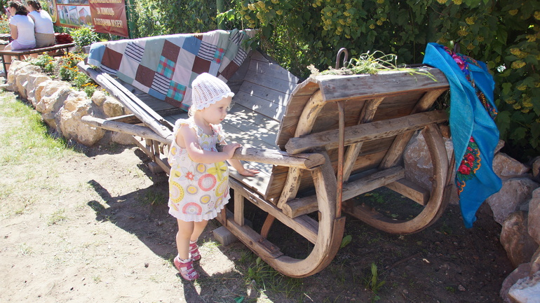 Во дворе музей целый набор: сани, телега, мельничный жернов, приспособление для сбора скошенной травы... Как не объясняла я Анюте, что "не в свои сани - не садись", она облюбовала именно этот вид транспорта.