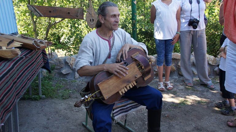 Сергей не просто играет, у него лекции-концерты. Буквально за 10 минут столько узнаешь из истории инструментов! Гугл - отдыхает. Он очень колоритный с русскими чертами, в народной рубахе... Рассказывает интересно, приводит много научных фактов, цитирует народные песни, плачи, веселые, печальные. Инструменты Сергей делает сам, из таких же материалов, какие использовали наши предки. К примеру, волынка у него из мешковины и стеблей борщевика. А на фото он играет на лире. Там сбоку специальная ручка, крутишь ее, и инструмент звучит наподобие шарманки.