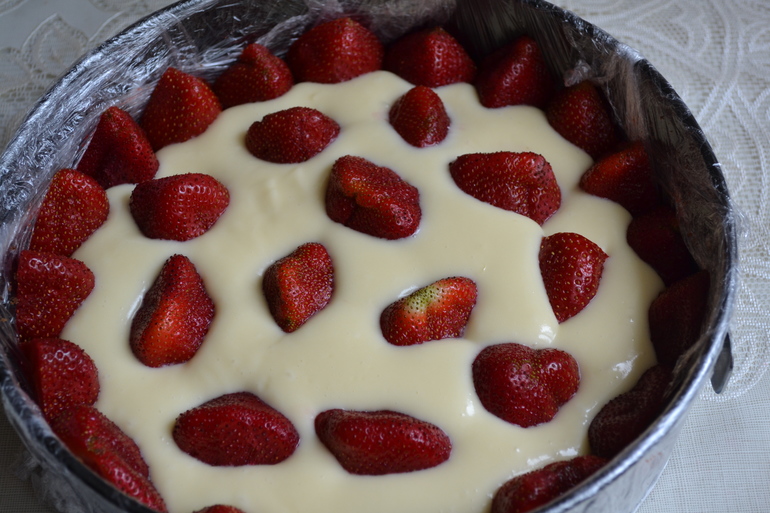 На дно формы поместить корж, пропитать его сиропом, половину клубники разрезать пополам поставить вдоль бортиков срезом наружу. Выложить 1/3 крема, затем в центр в произвольном порядке уложить вымытые и обсушенные ягоды клубники,