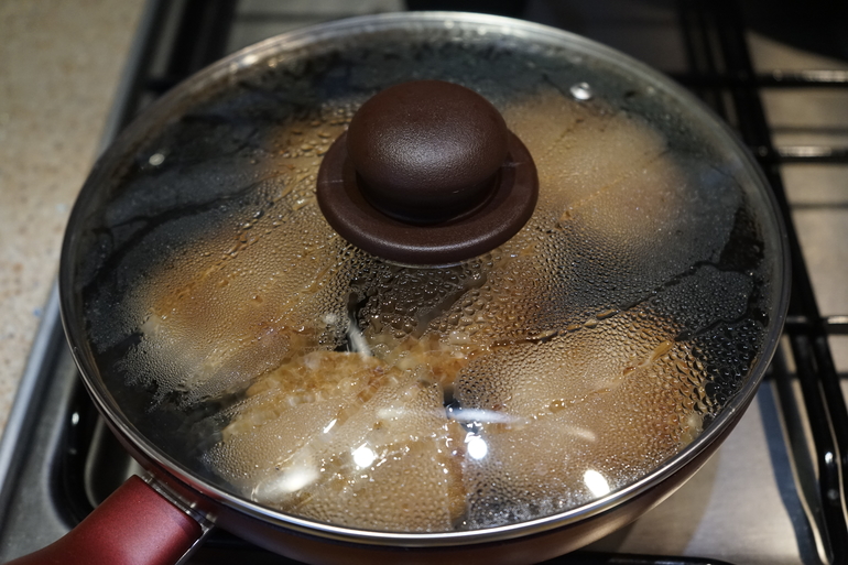 Закрыть крышкой, добавить 2 - 3 ст. ложки воды или мясного бульона и довести до готовности на медленном огне